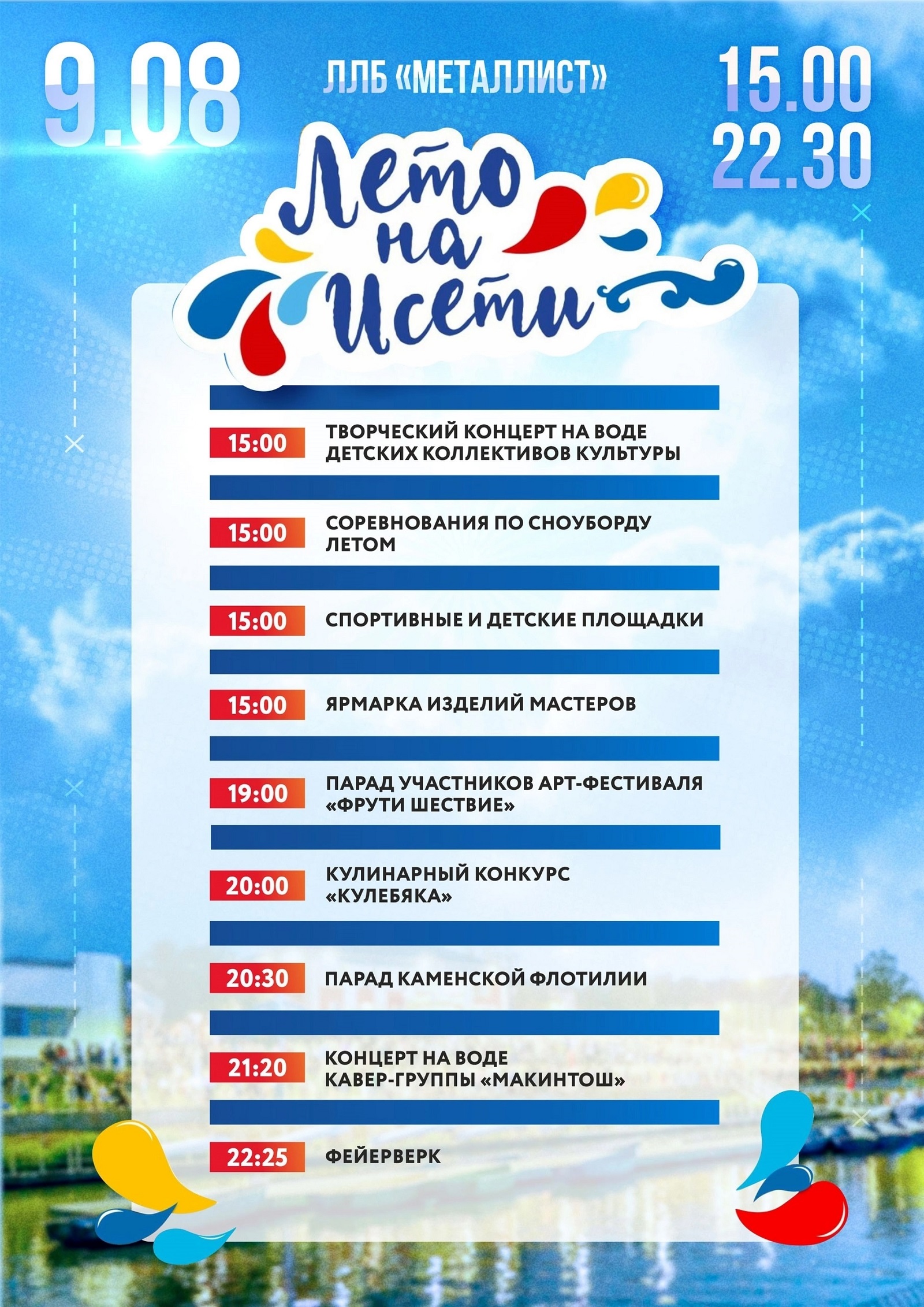 Одним из самых ярких событий года вновь станет фестиваль «Лето на Исети». Он пройдет в субботу, 9 августа, с 15:00 до 23:00 на лыжно-лодочной базе «Металлист» (ул. Гоголя, 44). Это по-настоящему семейный праздник. Поэтому организаторы готовят развлечения на любой вкус и возраст. В программе будут спортивные соревнования, различные игры и конкурсы, костюмированное шествие и выступления творческих коллективов.