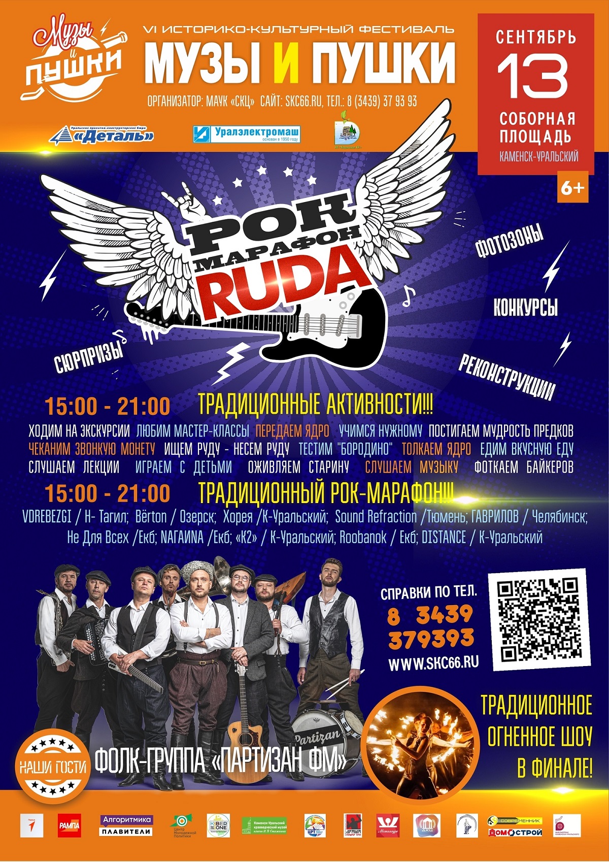 Файер-шоу, развлекательные и познавательные интерактивные зоны, громкая концертная площадка, на которой 6 часов играют уральский рок группы, прошедшие жесткий отбор. Финализирует музыкальный марафон этого года хедлайнеры фестиваля группа " Партизан ФМ" из Москвы.