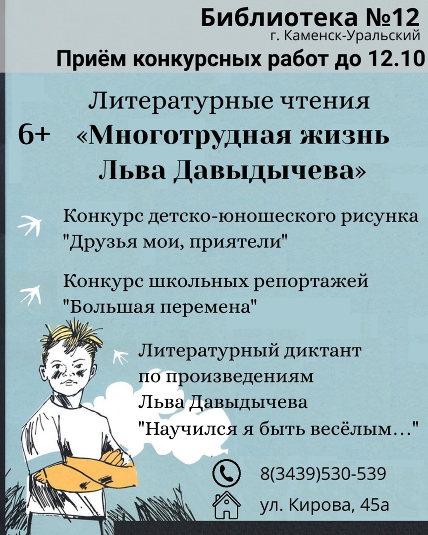 - конкурс детско-юношеского рисунка «Друзья мои, приятели». Проиллюстрируй отрывок из произведения Льва Давыдычева в любой технике. (Приём работ до 12 октября по адресу: Каменск-Уральский, ул. Кирова, 45а).