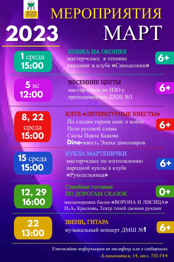 Анонс массовых мероприятий на март в детской библиотеке №8 им. Н. Островского (Алюминиевая, 14).