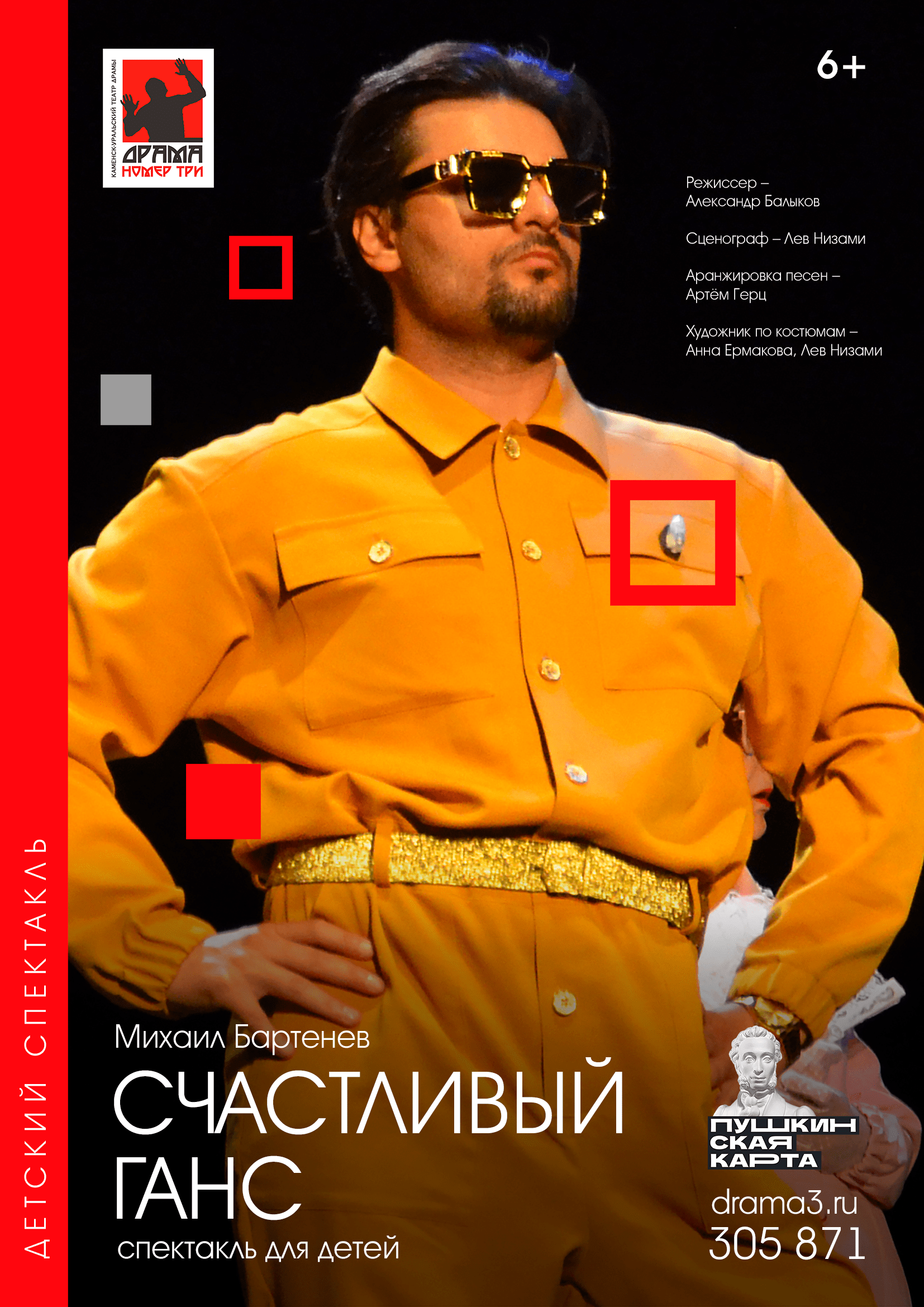 У него ничего нет. Он ходит по земле, любит играть и радуется. Его зовут Счастливый Ганс. А вот Хозяин, ему не до радости, потому, что его хозяйство - беспокойное. Изо всех игр он предпочитает только одну – считалочки. Только с этой игрой хозяйство сохраннее, ведь его все время надо пересчитывать. Ганс думает, что если человек попал в беду – ему, само-собой, нужно помочь, а Хозяин думает, что бесплатного ничего не бывает. Все самые нелепые моменты в этой сказке, как, собственно, и в жизни, происходят от того что люди не успевают дослушать друг друга. В спектакле ещё действуют Лошадь, Свинья, Гусыня и Золото, а как же без него!