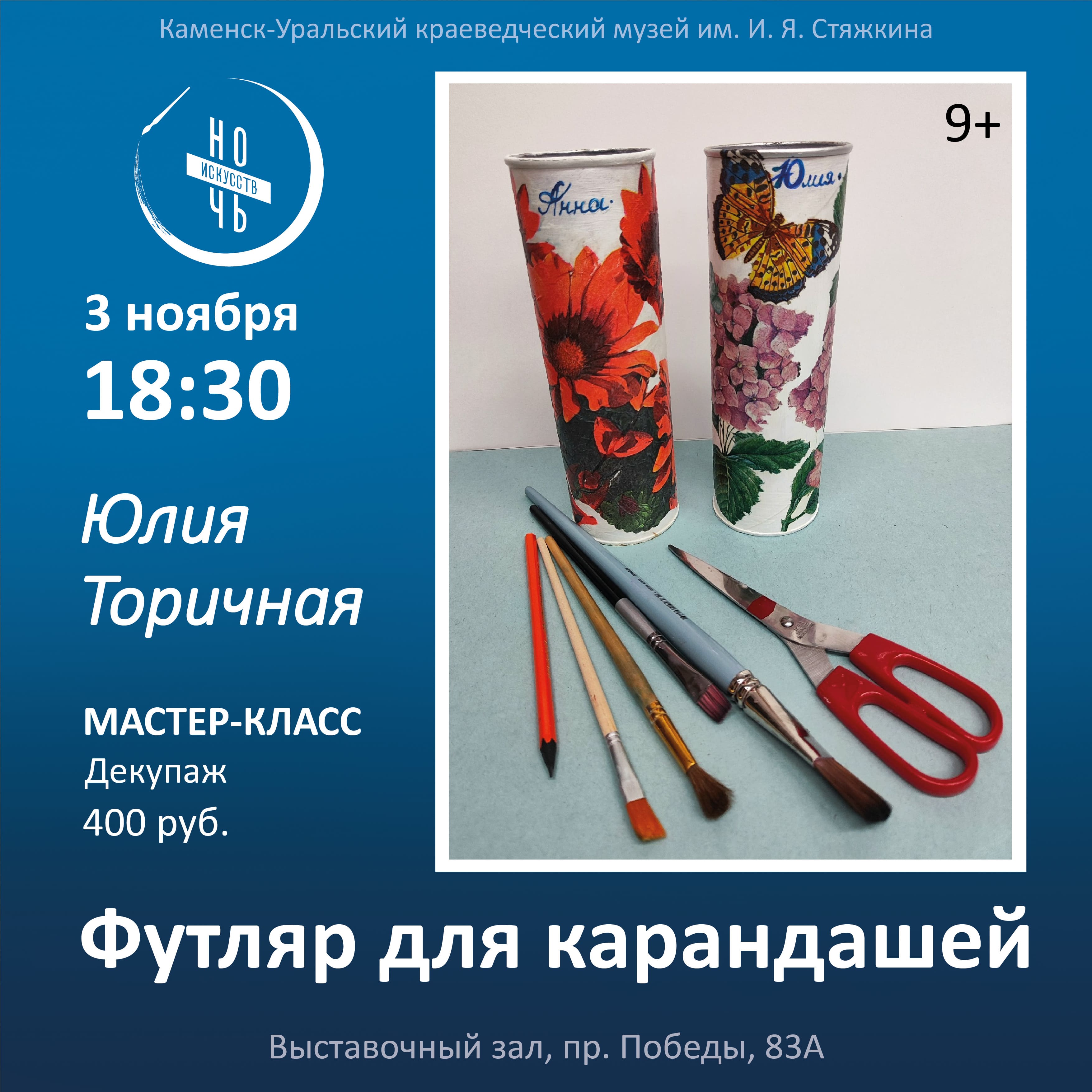 18.30-20.00. МАСТЕР-КЛАСС.  Юлия Торичная «Футляр для кистей и карандашей в технике «Декупаж», 9+. (400 руб.)