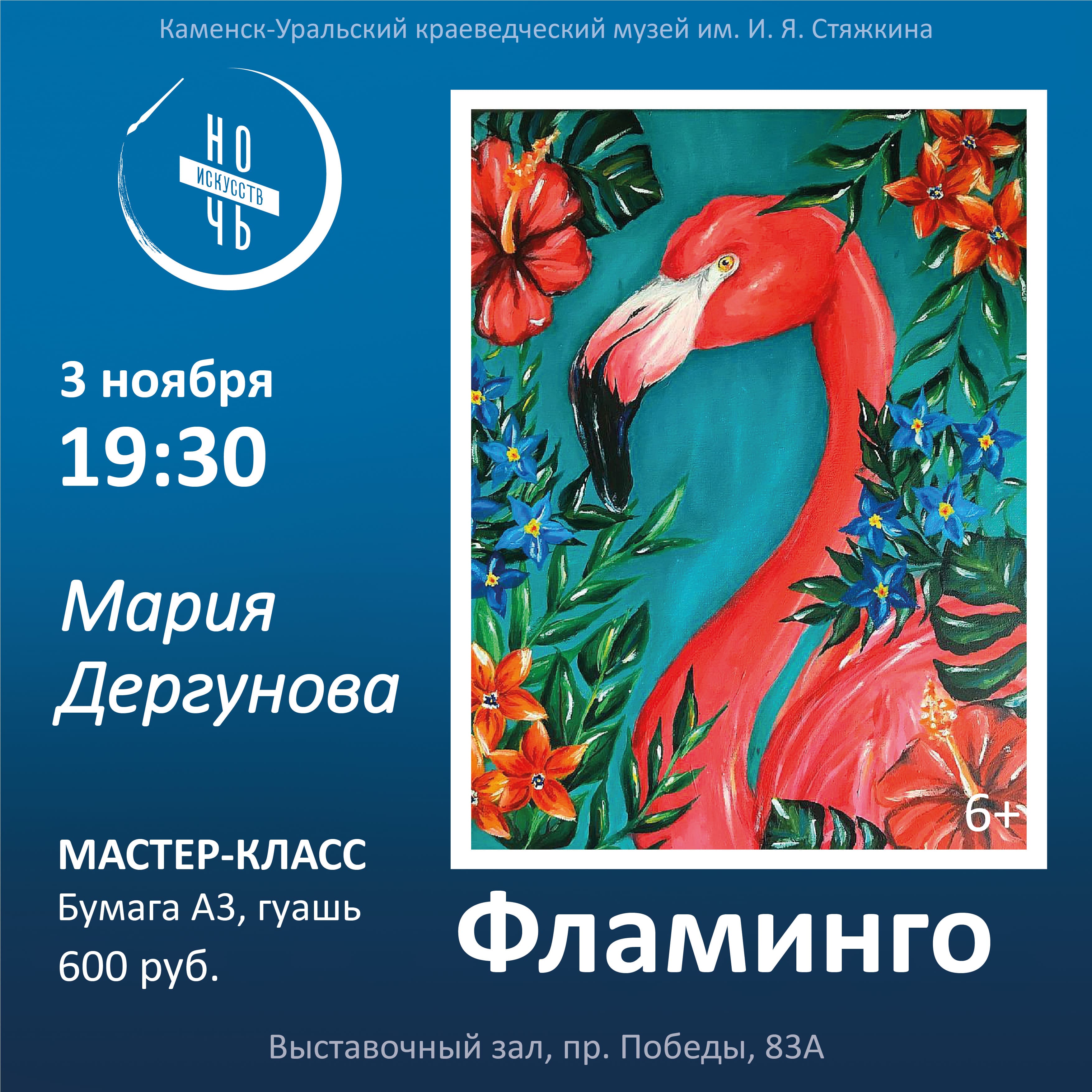 19.30-21.00. МАСТЕР-КЛАСС. Мария Дергунова «Фламинго», 6+. Бумага формат А3, гуашь (600 руб.)