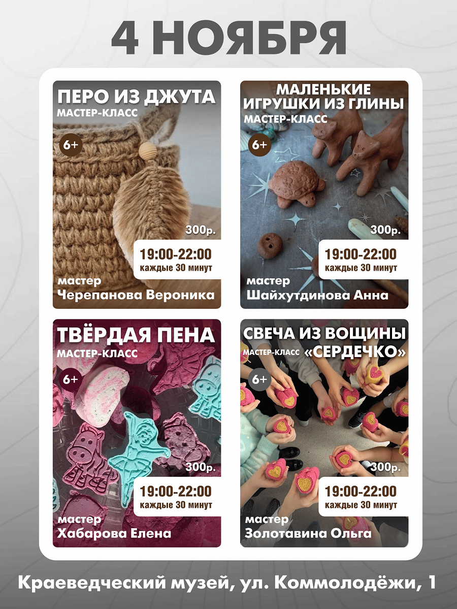 В Центральном корпусе пройдет интерактив для всей семьи. Посетителей ждут авторская экскурсия по выставке «Пузатый чайник» старшего научного сотрудника Аллы Лесуновой, далее начнется семейная викторина «Давай поговорим за чашкой чая» и несколько мастер-классов по изготовлению коробочки «Чайничек», солевых бомбочек для ванны, свечей из вощины, игрушек из глины. Стоимость мастер-классов – 300 руб.