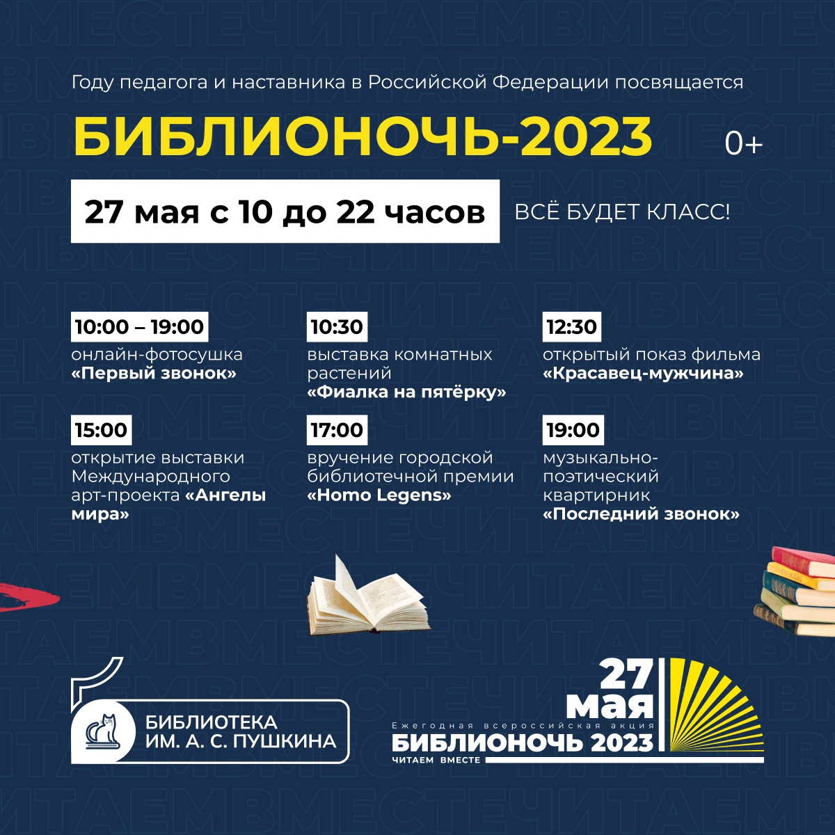 27 мая Центральная городская библиотека им. А. С. Пушкина присоединится к Всероссийской акции «Библионочь». В этом году она посвящена Году педагога и наставника в Российской Федерации. Тема акции в Свердловской области «Открытый урок: читаем вместе», девиз: «Всё будет класс!».