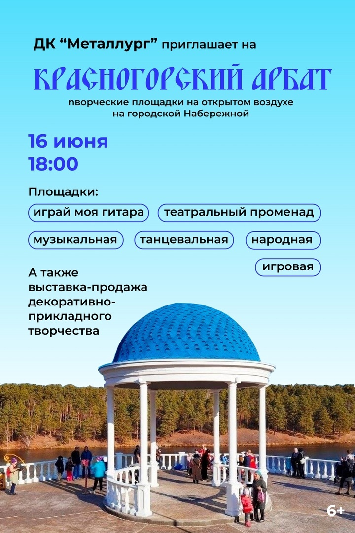 16 июня июня дворец культуры "Металлург" одним... нет! - множеством творческих площадок превратит каменскую набережную в одной большое арт-пространство под названием "Красногорский Арбат".
