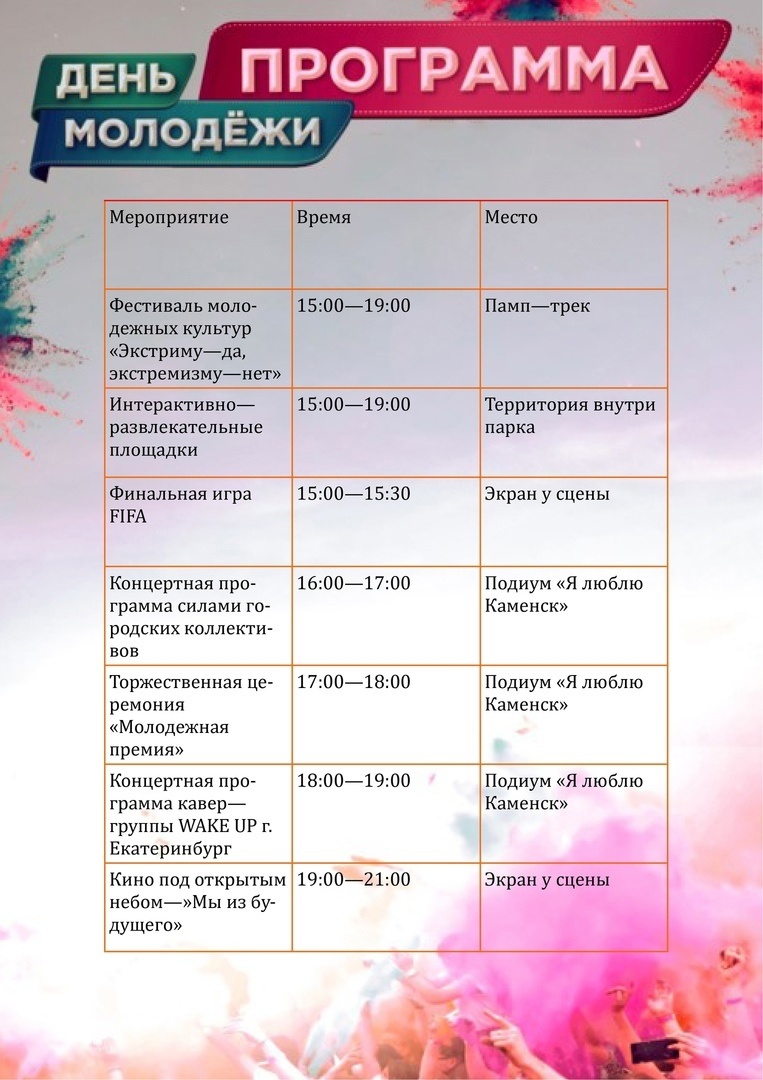 Фестиваль уличной культуры, мастер-класс по программированию, игра FIFA, вручение молодежной премии и много музыки запланированы в честь Дня российской молодежи в Каменске-Уральском. Максимум активностей для юных и дерзких каменцев проведут в городском парке «Космос».