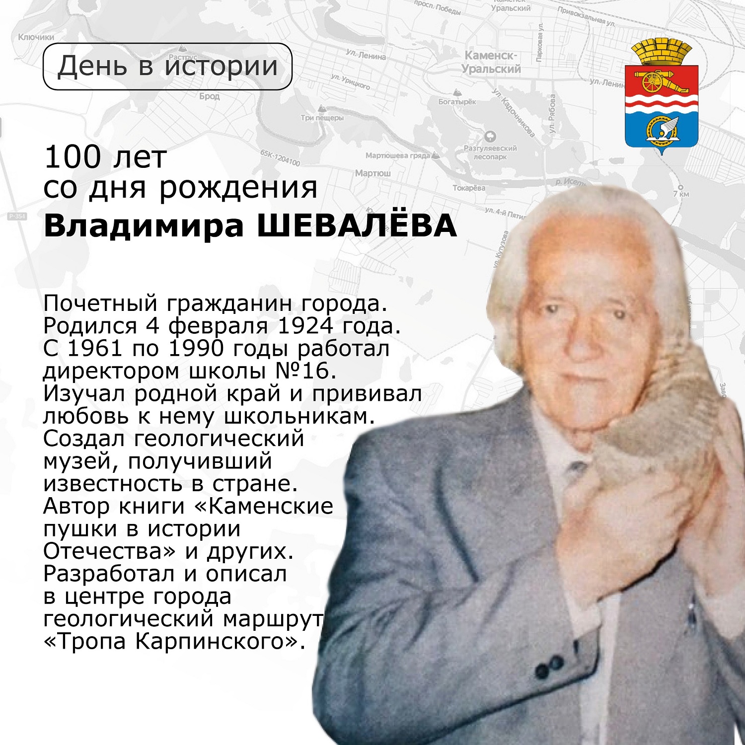 4 февраля педагогу, географу, краеведу, Почетному гражданину Каменска-Уральского Владимиру Шевалёву исполнилось бы 100 лет. В честь знаменательной даты в нашем городе проходят выставки, встречи, организованы экспозиции. В Геологическом музее прошло первое торжественное мероприятие, посвящённое 100-летию со дня рождения Владимира Петровича. Близкие и ученики на встрече делились воспоминаниями, пели песни и читали стихи, посвященные геологу.