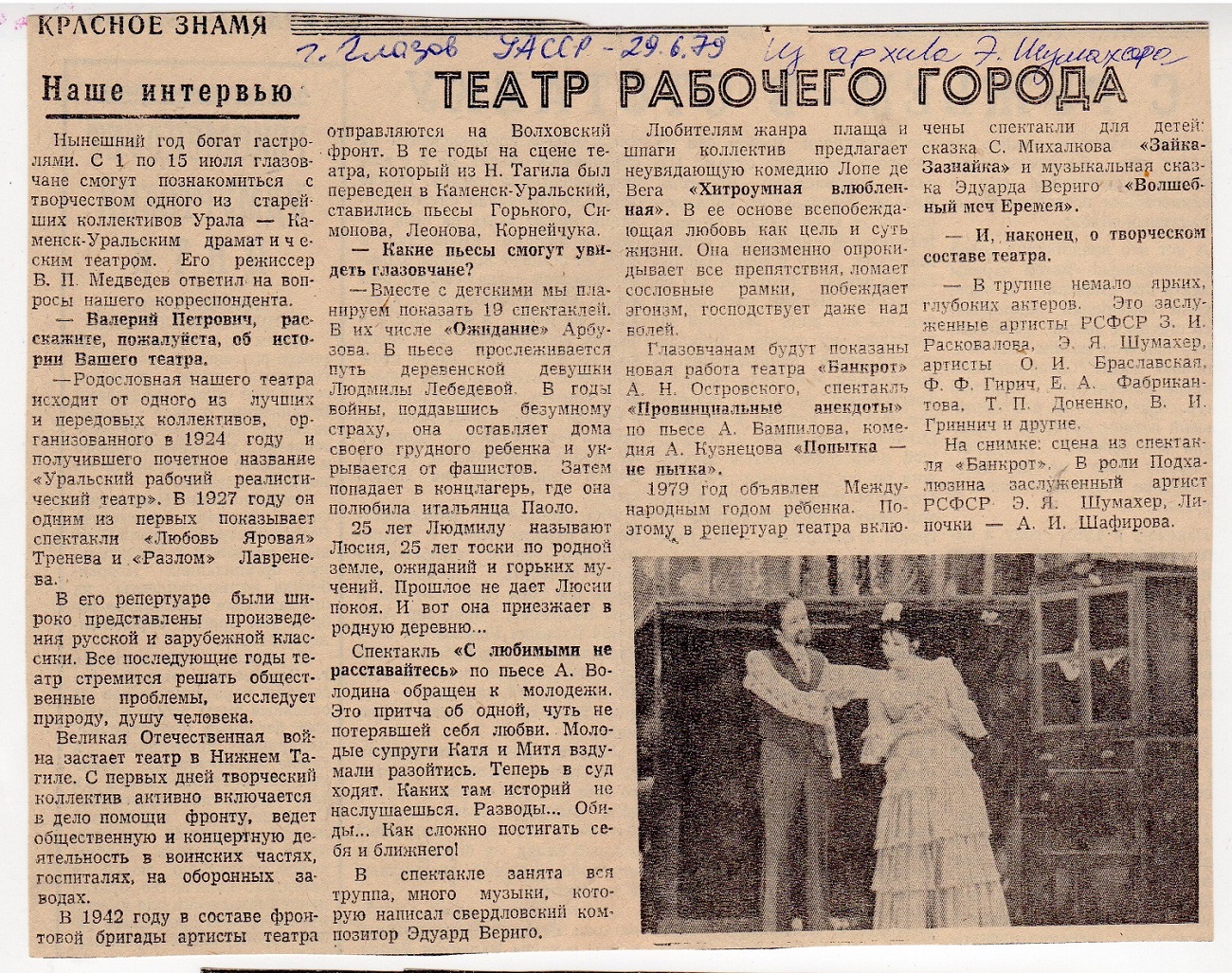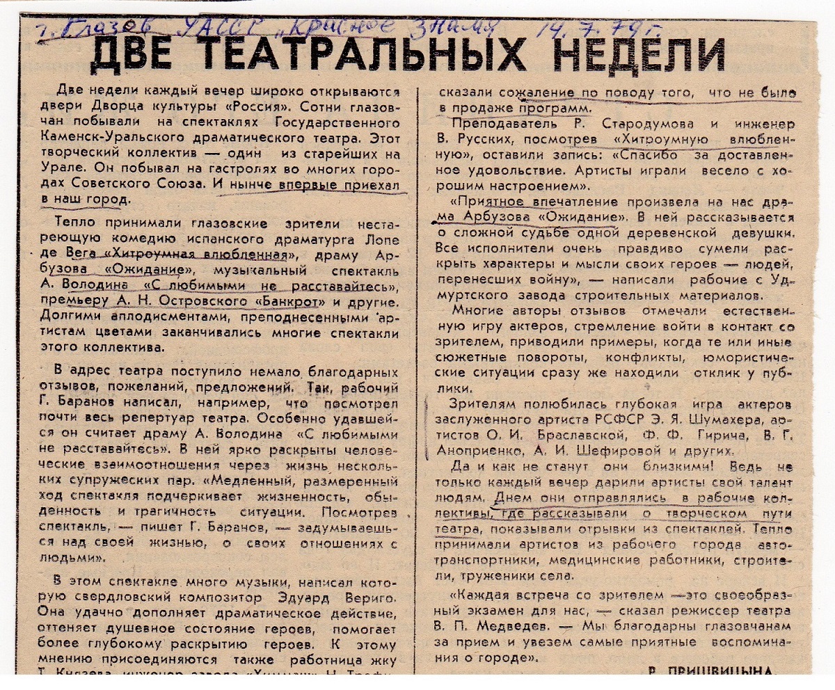 Летом этого года исполнится 45 лет как Каменск-Уральский, тогда ещё государственный, театр побывал с гастролями в городе Глазове Удмуртской АССР. Свидетельством тому - две газетные заметки, которые были на днях обнаружены в архиве театра, в папке, переданной лично бывшим артистом театра Эдуардом Яковлевичем Шумахером, в настоящее время проживающем в Германии.