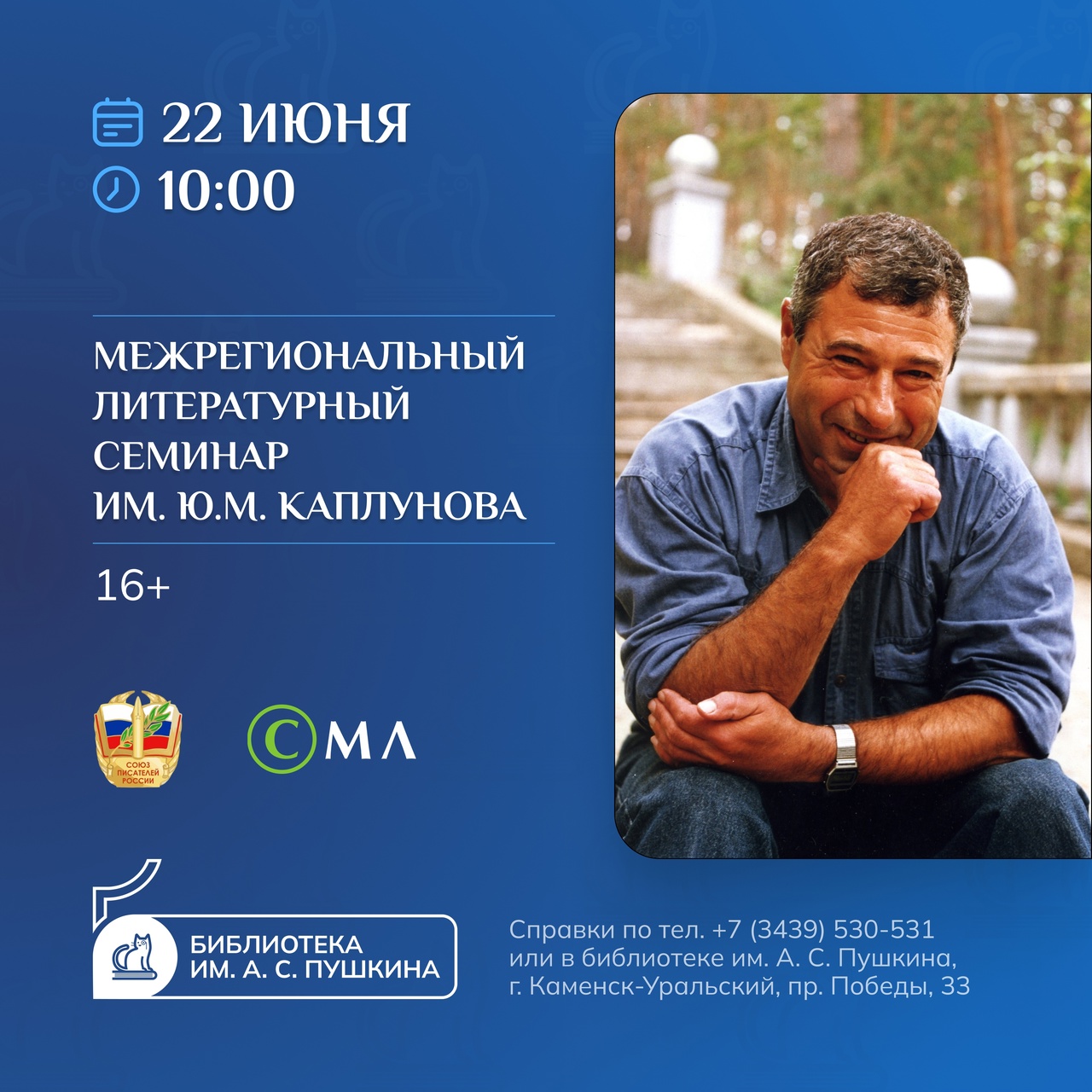22 июня в Каменске-Уральском состоится межрегиональный семинар Союза писателей России для литераторов Свердловской, Курганской и Челябинской областей. Семинар посвящён памяти поэта Юрия Каплунова (1944 – 2021) – создателя «Каменской поэтической аномалии», более 40 лет руководившего городским литературным объединением.