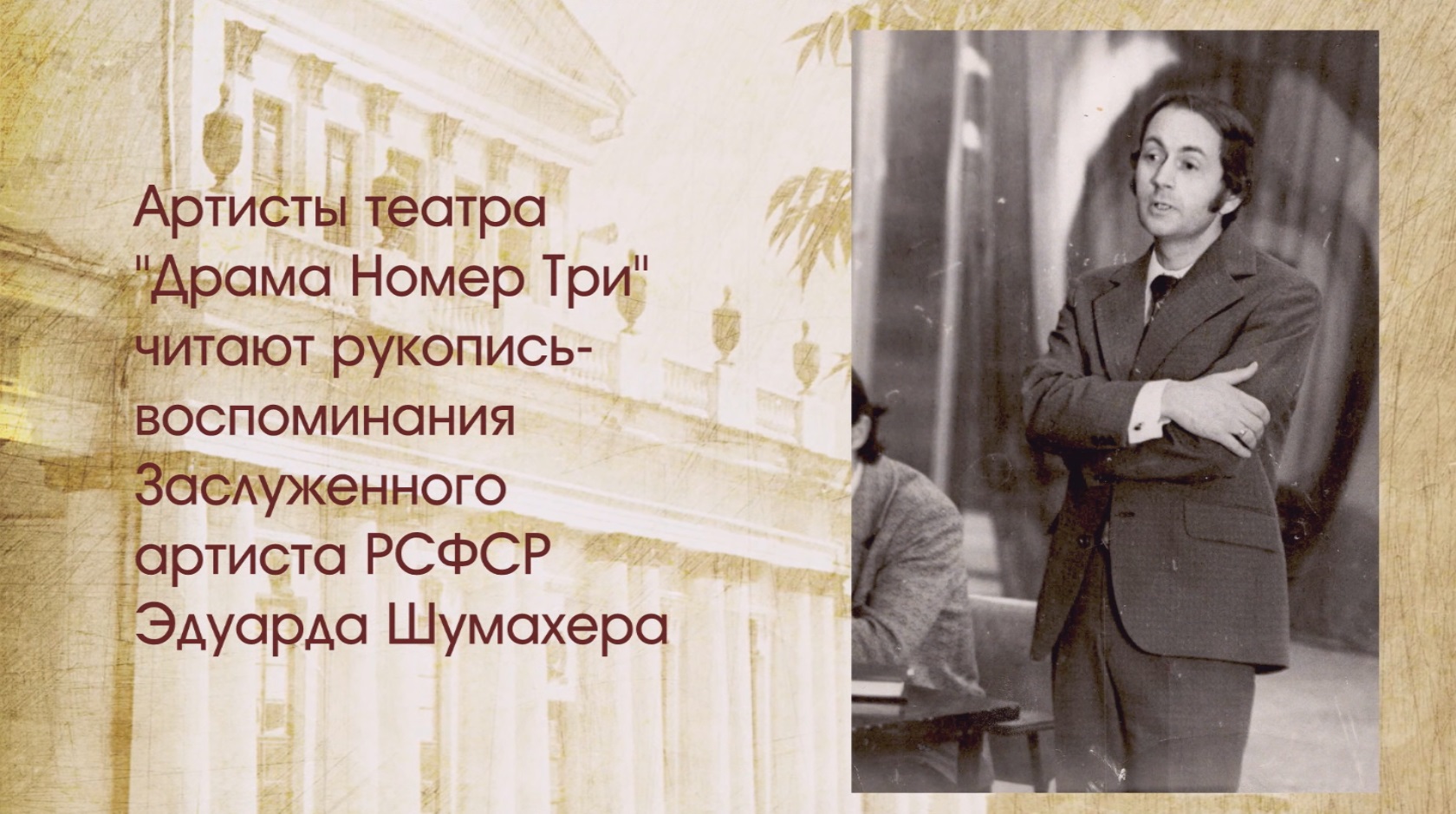 Драма Номер Три начала выпуск нового онлайн-цикла «Земляки. Вторая серия» в этом цикле артисты Каменск-Уральского городского храма Мельпомены читают воспоминания бывшего актёра этого театра, заслуженного артиста РСФСР Эдуарда Шумахера.