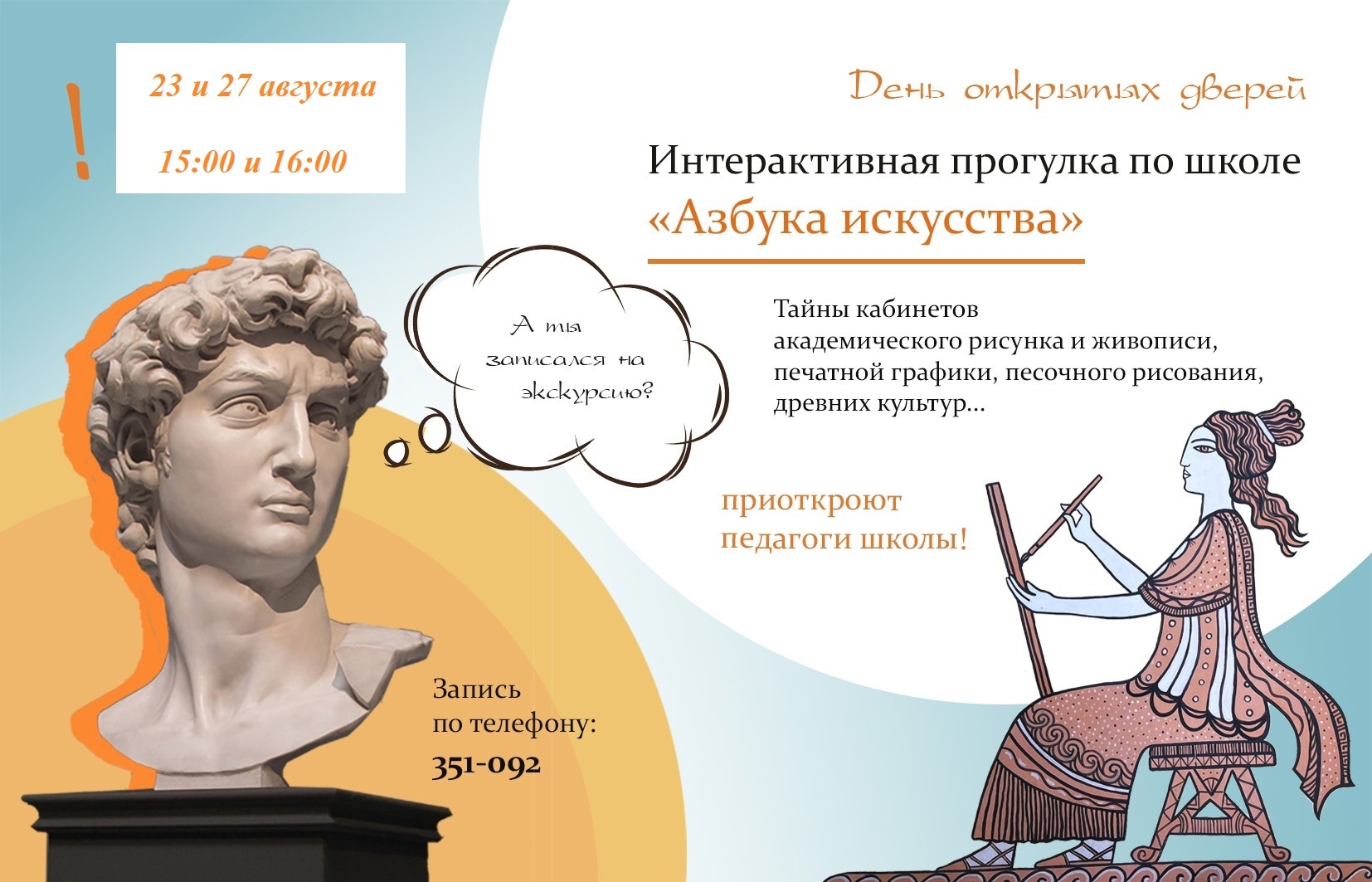 23 и 27 августа художественная школа приглашает на интерактивную прогулку, когда можно будет посетить буквально каждую мастерскую художественной школы, заглянуть в каждый уголок, поучаствовать в творческих активностях и познакомиться с ведущими преподавателями.