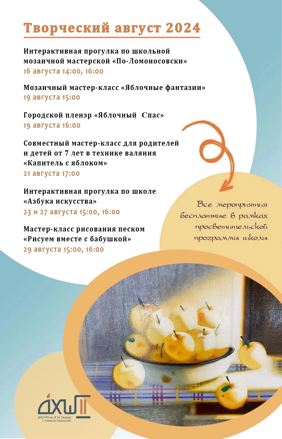 В Детской художественной школе № 2 им. В.М. Седова стартует большой культурный проект «Творческий август-2024». В его рамках запланированы интерактивные события для каменских семей.