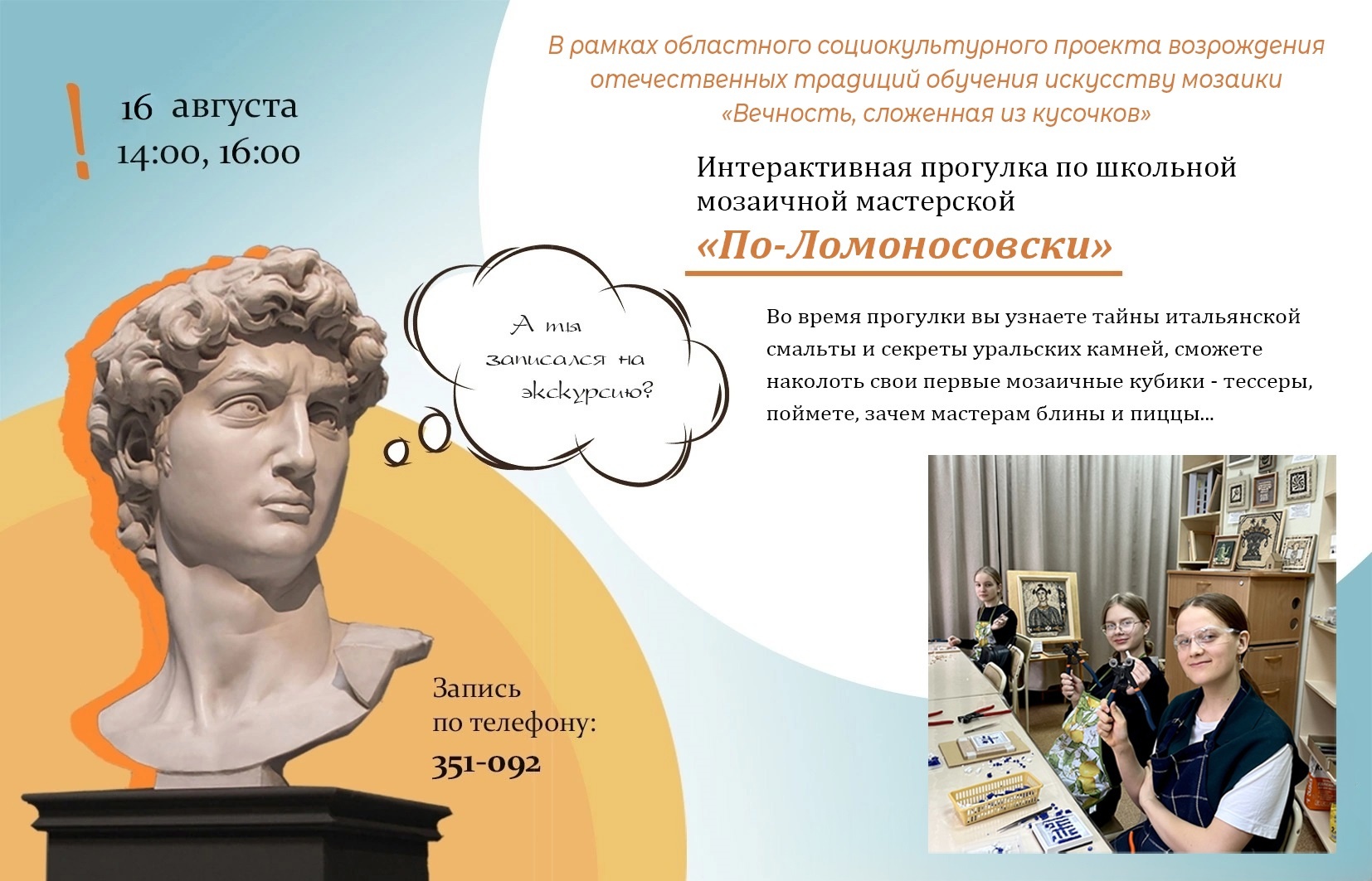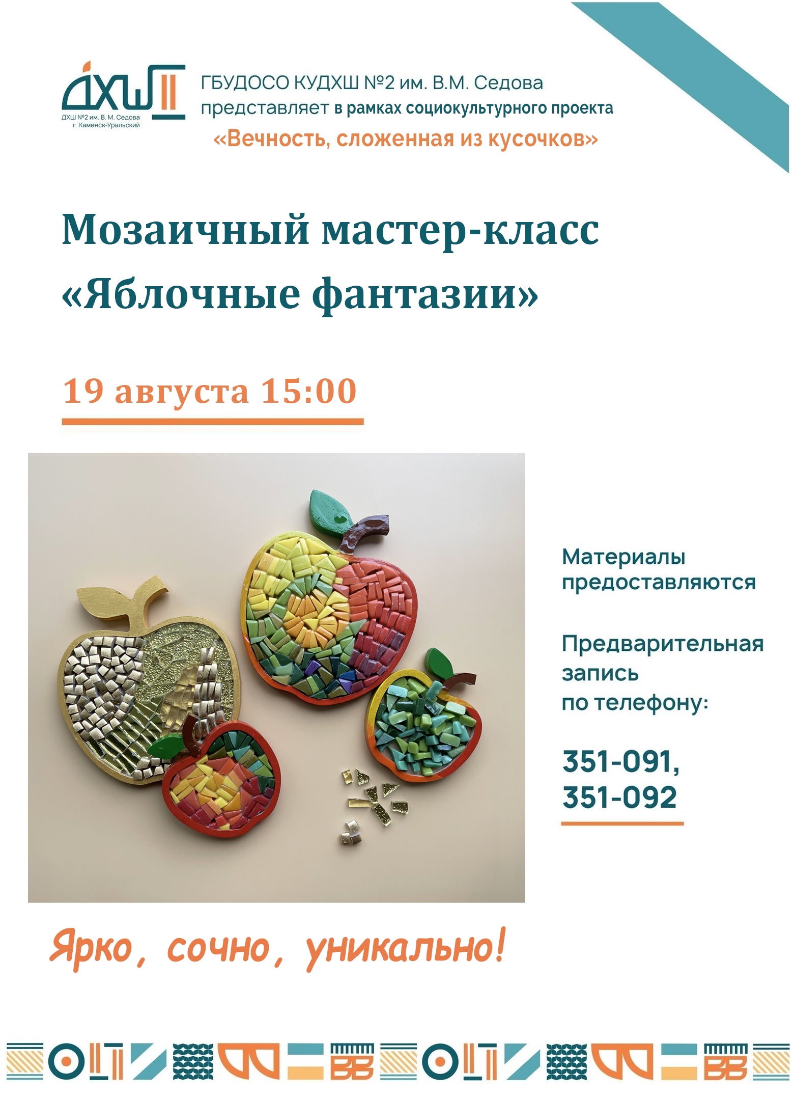 Уже 16 августа у жителей города появится уникальная возможность посетить одно из самых таинственных мест художественной школы – мозаичную мастерскую «По-Ломоносовски». Во время интерактивной прогулки гости познакомятся с закулисьем творческого процесса создания мозаичных работ, которые были представлены уже не на одной выставке прикладного творчества городского и областного уровней и получили высокую оценку профессионалов. А 19 августа в рамках проекта «Вечность, сложенная из кусочков» гости школы смогут создать свою первую мозаику на мастер-классе «Яблочные фантазии».