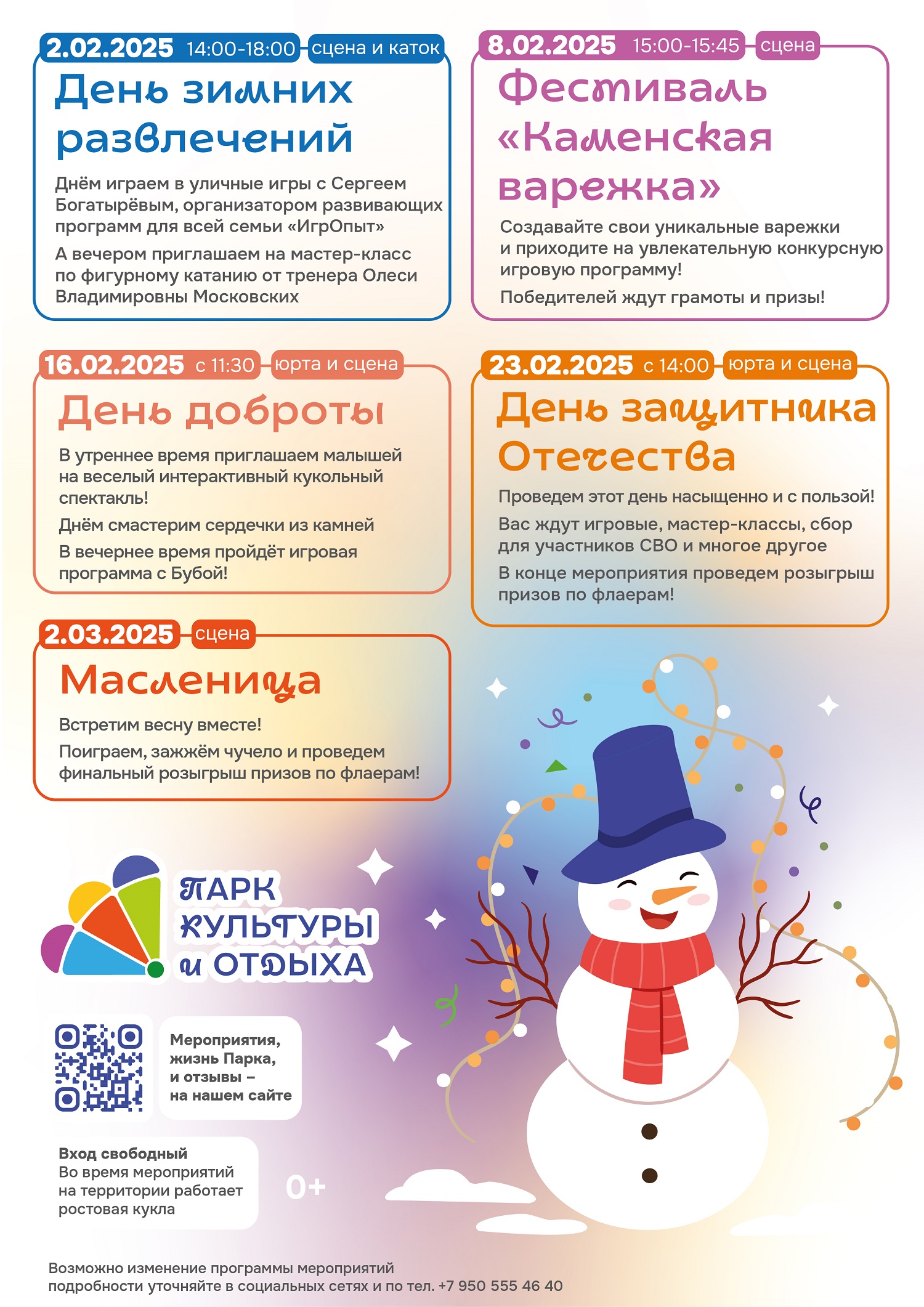 - с 14:00 до 15:00 у сцены Парка пройдут уличные игры. Расскажет и покажет зимние развлечения Сергей Богатырёв, организатор развивающих программ для всей семьи "ИгрОпыт".