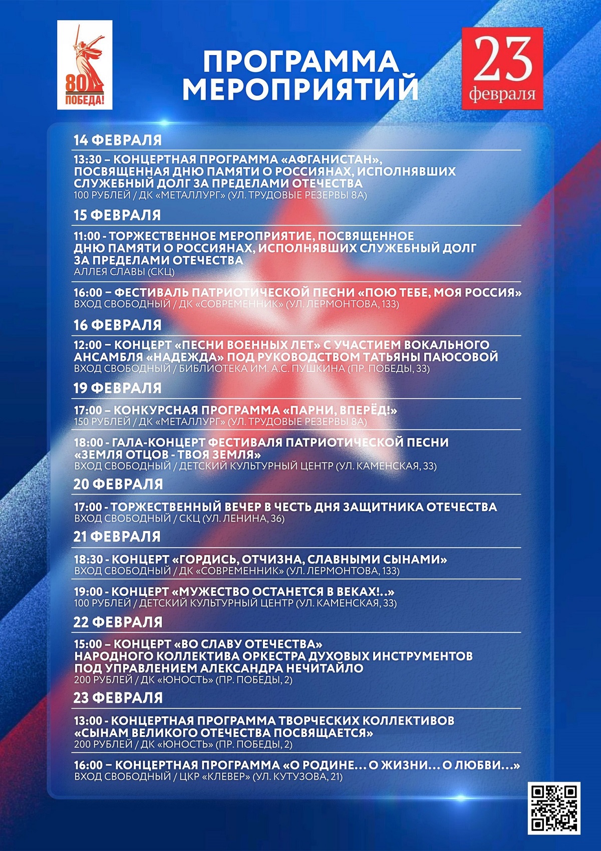 16 февраля − концерт «Песни военных лет» с участием Вокального ансамбля «Надежда» под руководством Татьяны Паюсовой.