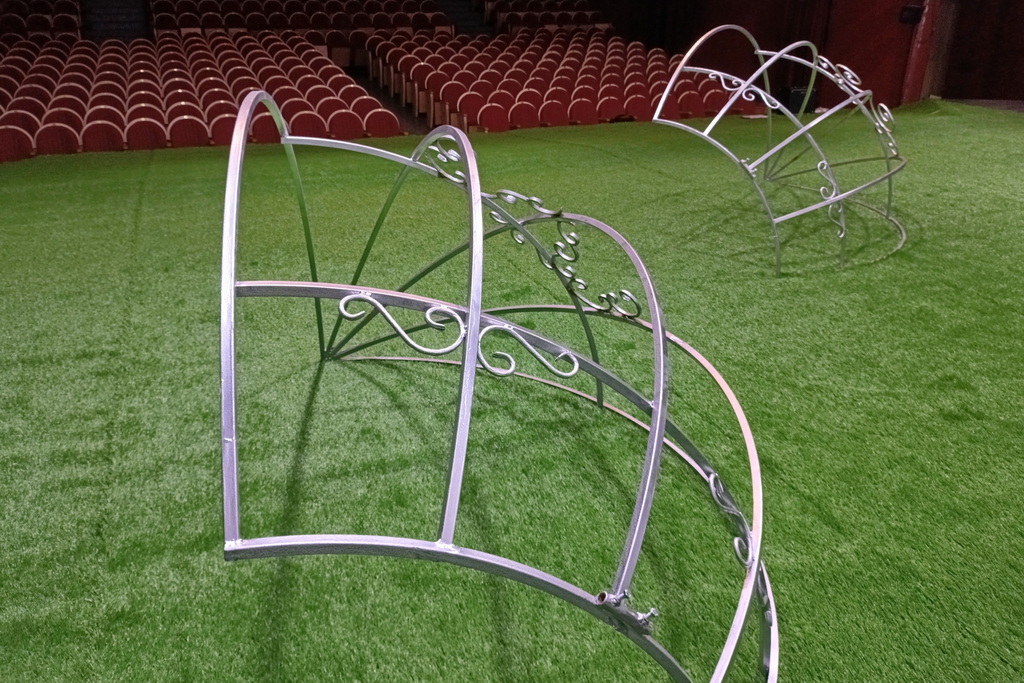 Газон, как ни странно, самая простая часть. Мы заказали профессиональное покрытие, предназначенное для футбольных полей. Настоящее испытание – это огромная сфера, «сфера Хиггинса». Она сделана из металла и поликарбоната. Сфера поднимается и опускается с помощью лебёдки, может раскрываться, как цветок или кокон. В финале спектакля именно она становится пространством для Хиггинса и Элизы − их планетой, их миром. Воплощать такие замыслы мне помогает художник Лев Низами. Мы работаем вместе уже давно, почти без слов понимаем друг друга. Я, как умею, делаю наброски, а Лев превращает их в инженерно-точные чертежи. Его сценография всегда живая, интересная и при этом функциональная.