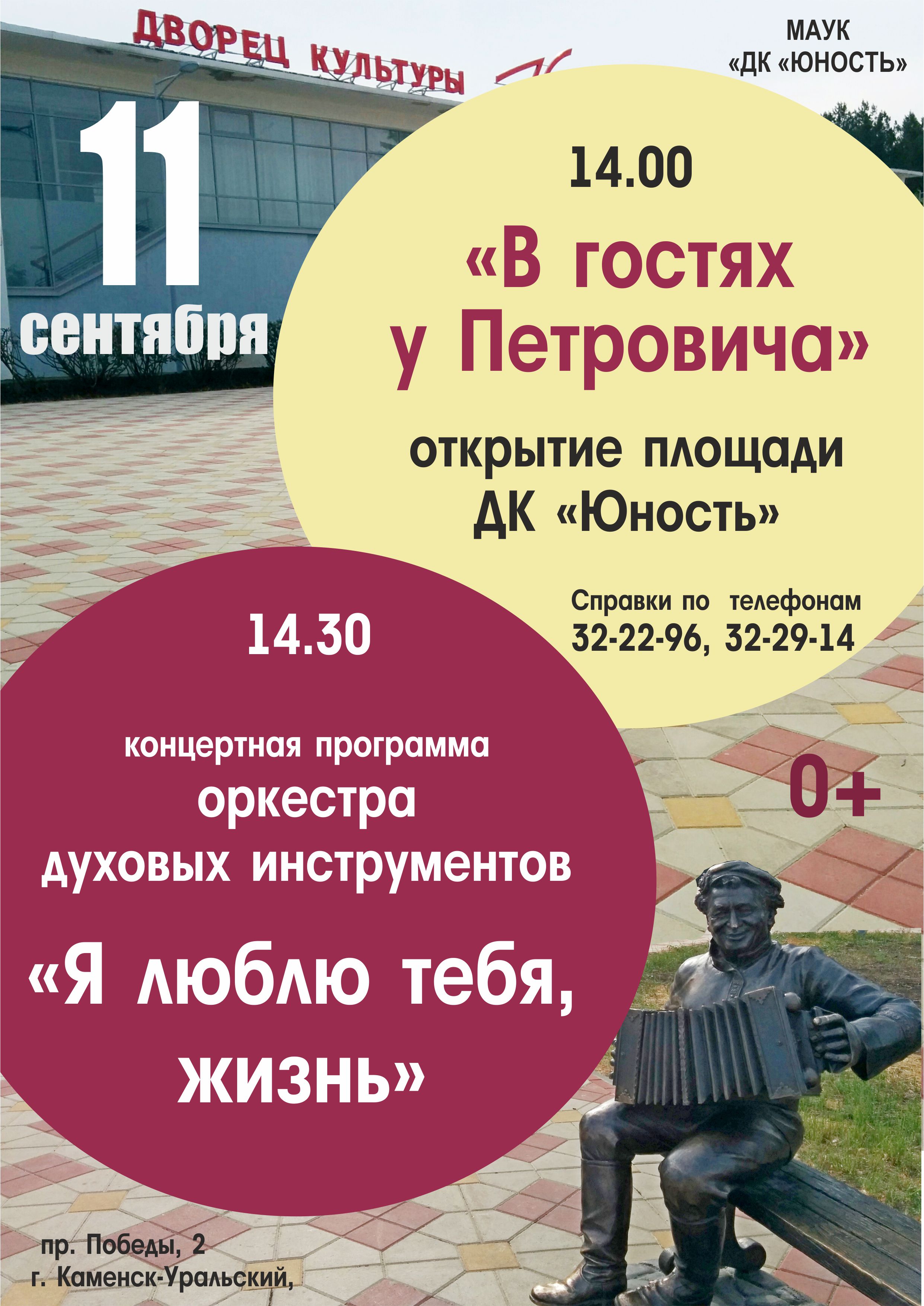 В 14.00 творческий коллектив ДК «Юность» приглашает на концертную программу «В гостях у Петровича», посвященную завершению работ по благоустройству у дворца и за его пределами - на Аллее Славы, площадь перед СК «Олимп».
