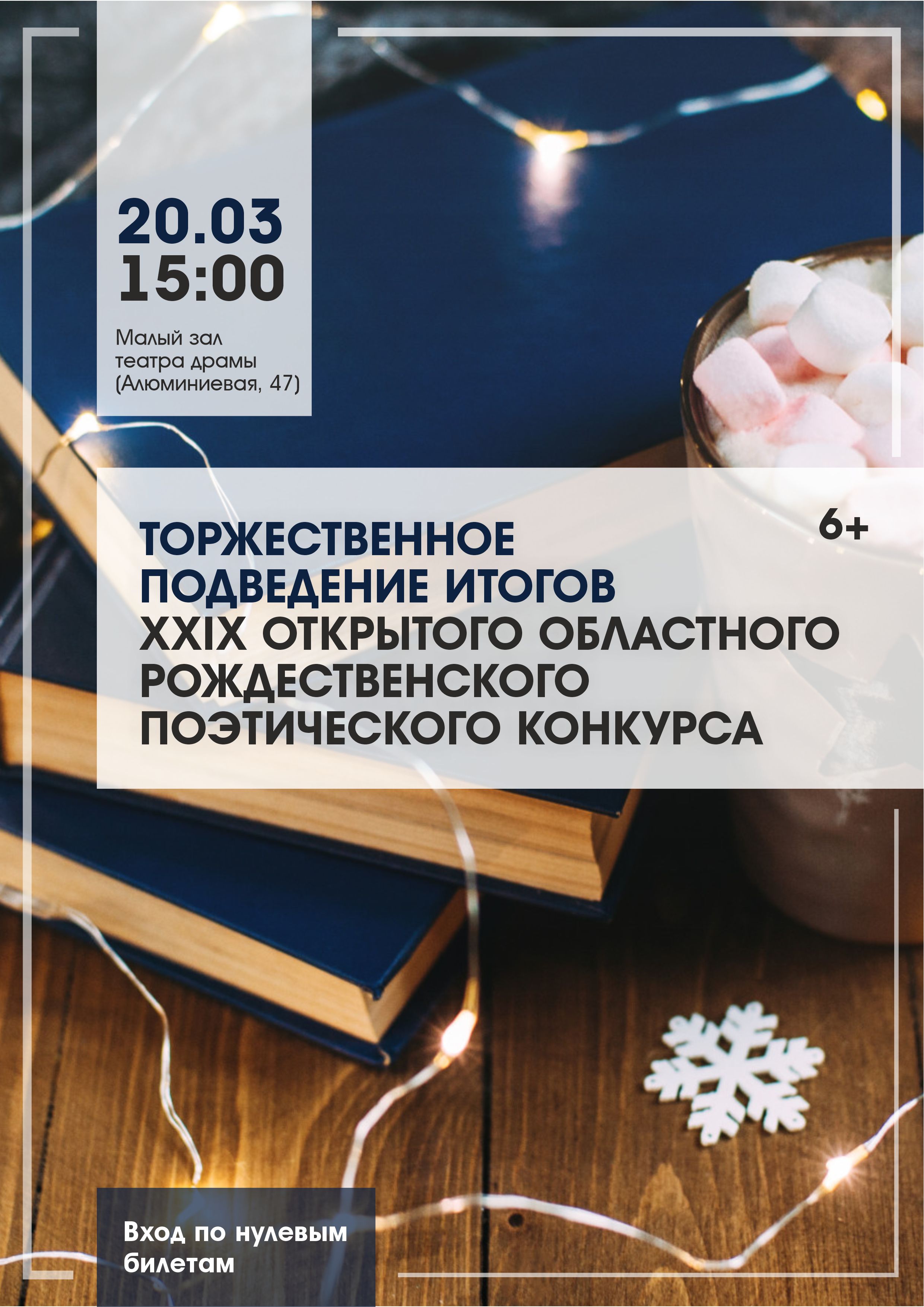20 марта в Каменске-Уральском огласят итоги XXIX Рождественского поэтического конкурса. Награждение победителей и призеров состоится в 15 часов в малом зале театра драмы (ул. Алюминиевая, 47).