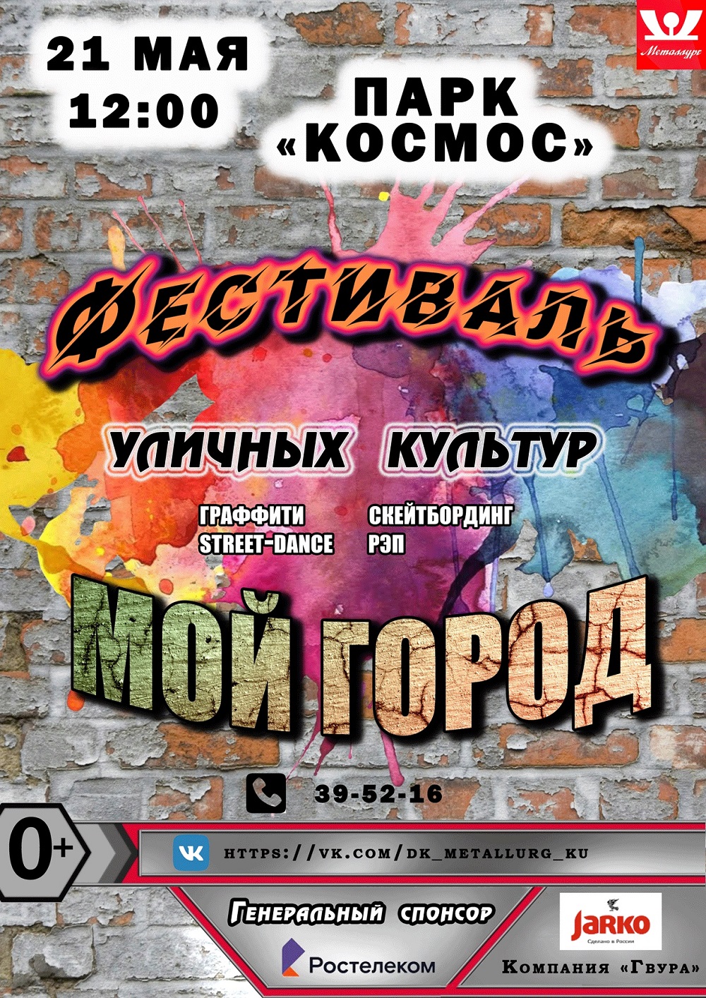 В седьмой раз в Каменске-Уральском состоится открытый городской молодежный фестиваль уличных культур «Мой город». В прошлом году мероприятие в первый раз прошло в парке «Космос», в этом году – организаторы: дворец культуры «Металлург», решили повторить и расширить программу фестиваля здесь же.