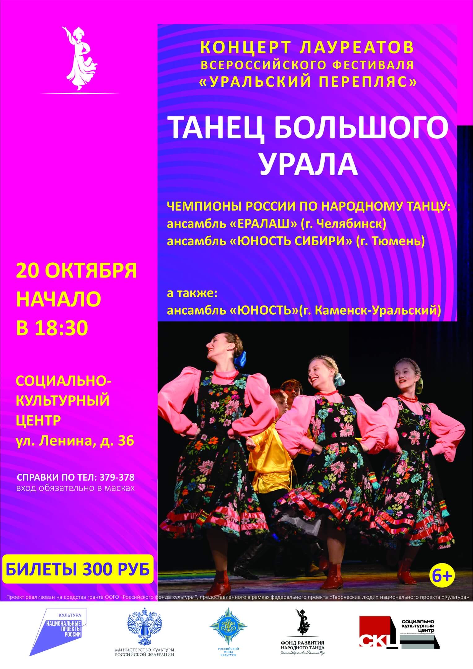 20 октября заявлен концерт лауреатов всероссийского фестиваля «Уральский перепляс» - «Танец большого Урала». Каменские зрители увидят выступление трех коллективов: ансамбль «Ералаш» (г. Челябинск), ансамбль народного танца «Юность Сибири» (г.Тюмень) и прославленный каменский коллектив – Народный коллектив ансамбль танца «Юность».