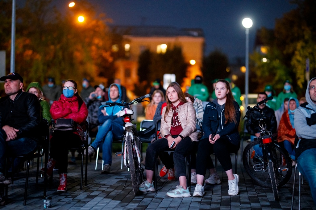 Организаторы – Социально-культурный центр подготовили площадку для просмотра: расставили стулья в соответствии с соблюдением норм социальной дистанции и предлагали всем обработать руки дезинфицирующим раствором.