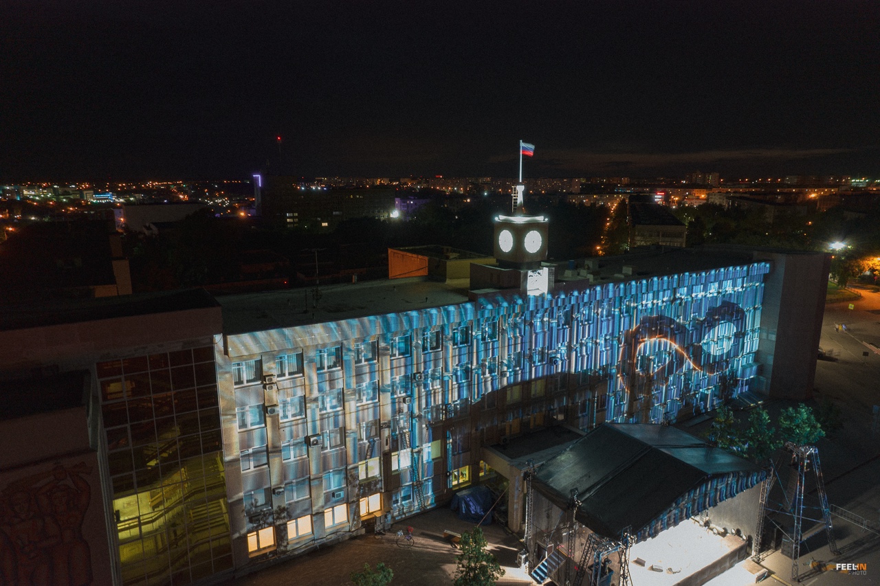 На фасаде здания администрации показали историю металла алюминий – от начала времен до наших дней. Помогла трансформировать фасад реалистичными образами 3D-графика.
