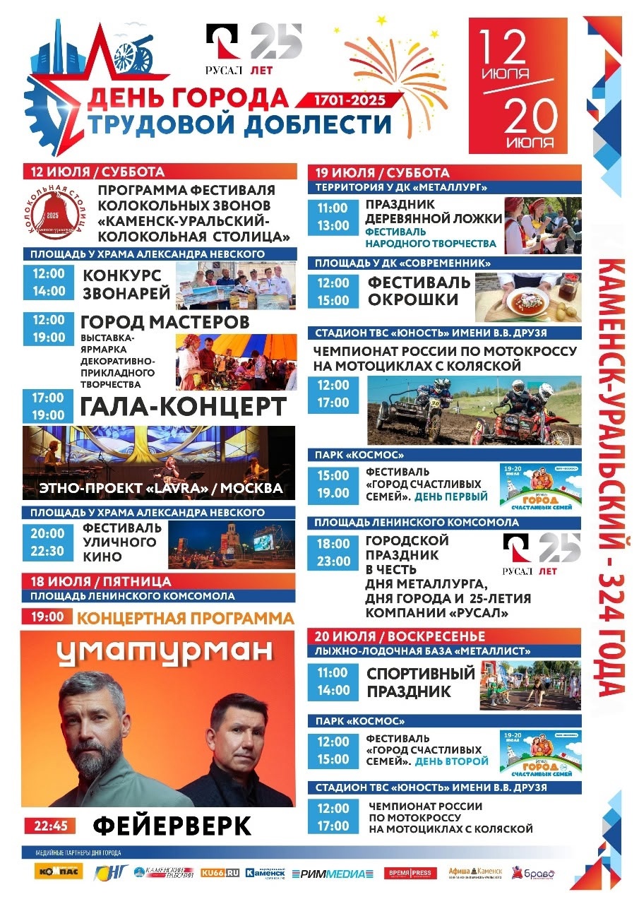 В 2025 году Каменск-Уральский празднует свое 324-летие! Гостей и жителей города ждет насыщенная программа мероприятий, включающая фестивали, концерты, захватывающие спортивные соревнования и душевные семейные праздники.
