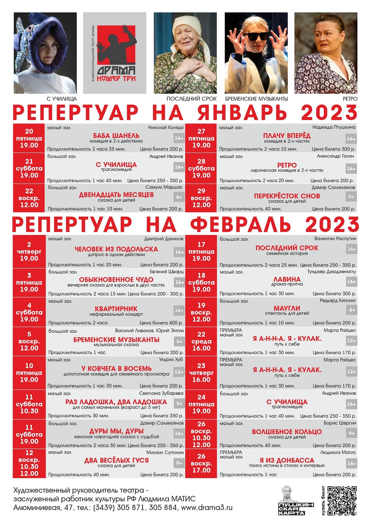 Драма Номер Три - участник федеральной программы Пушкинская карта. В 2023 году на балансе карты - 5000 рублей. Воспользоваться средствами можно при походе в культурные учреждения по всей стране.